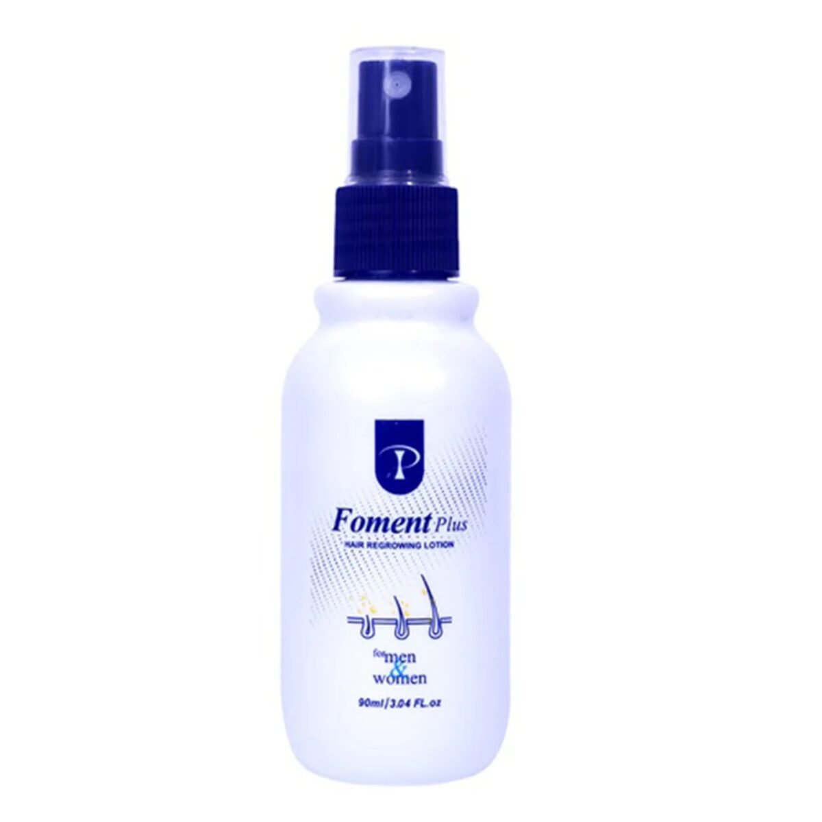 Foment Plus hair re-growing lotion is available in 90 ml, HDE plastic bottle with a spray application in carton pack.